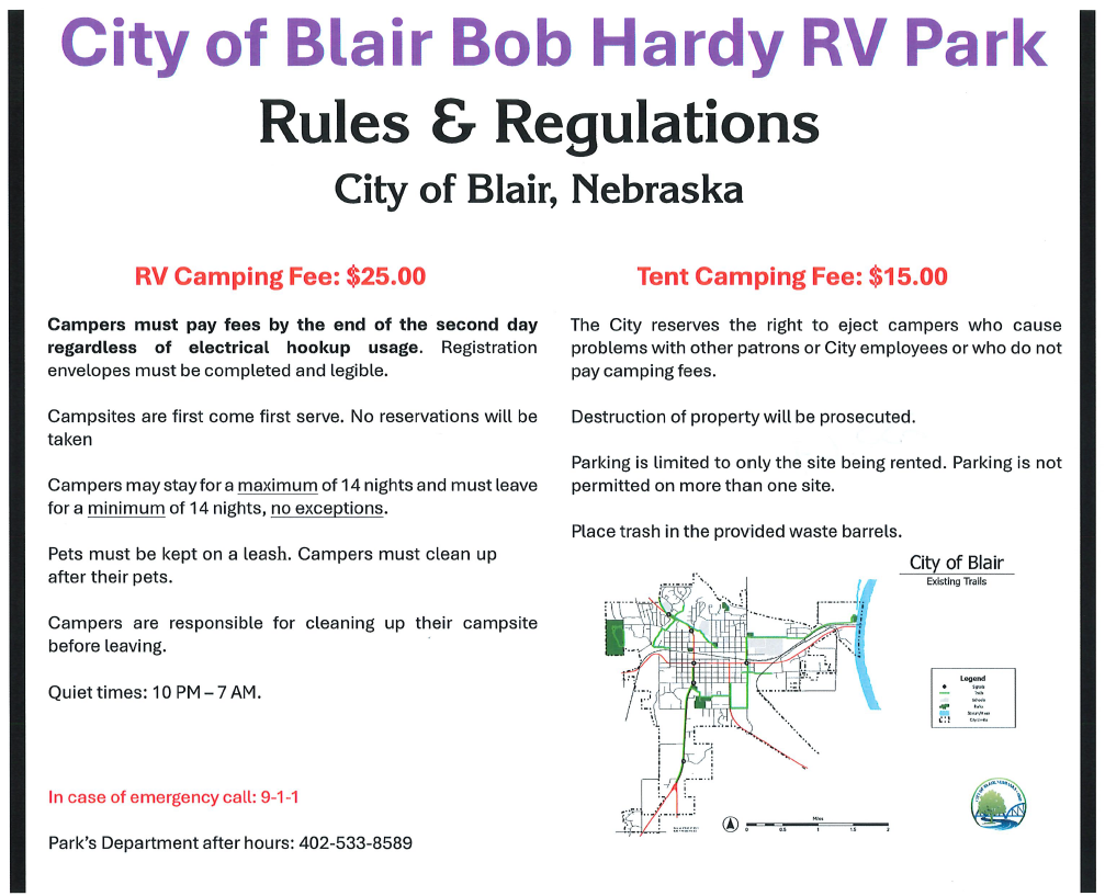 CITY OF BLAIR DOES NOT TAKE RESERVATIONS FOR THIS PARK. IT IS A FIRST COME, FIRST SERVE BASIS. Payment is made on a honor system and payment envelopes are located at the shower facility.